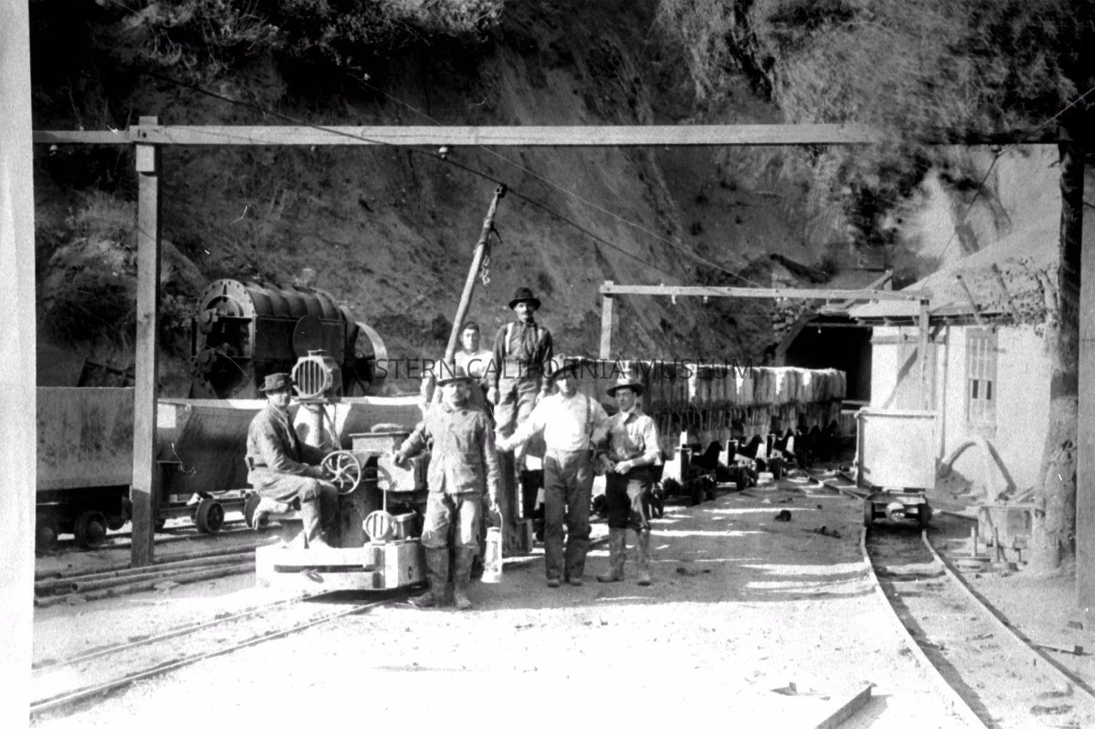 B & W digital scan of LA Aqueduct Miners and Mucking Cars at Unidentified Tunnel Portal. Note Miner holding Carbide Lamp and Electric Locomotive used to haul Mucking Cars.