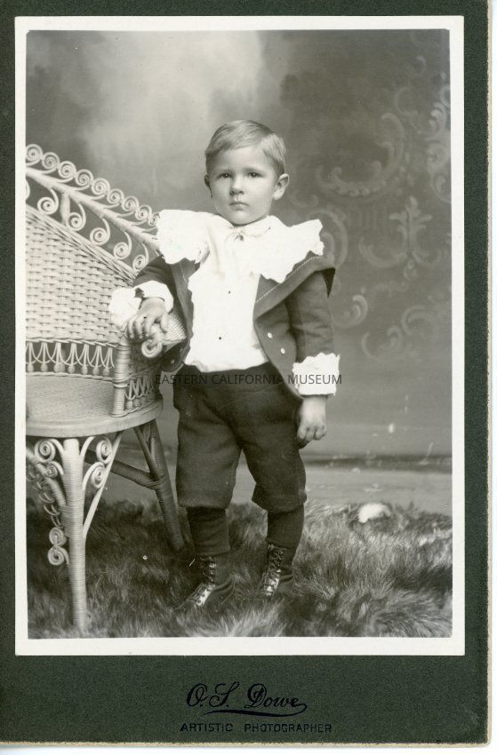 Mounted photo of a young boy posing for a studio portrait next to a wicker chair. He is wearing an outfit that looks more like a costume--ruffles at neck and wrists. The studio's information is impressed in the matting: "O. S. Dowe, Artistic Photographer."