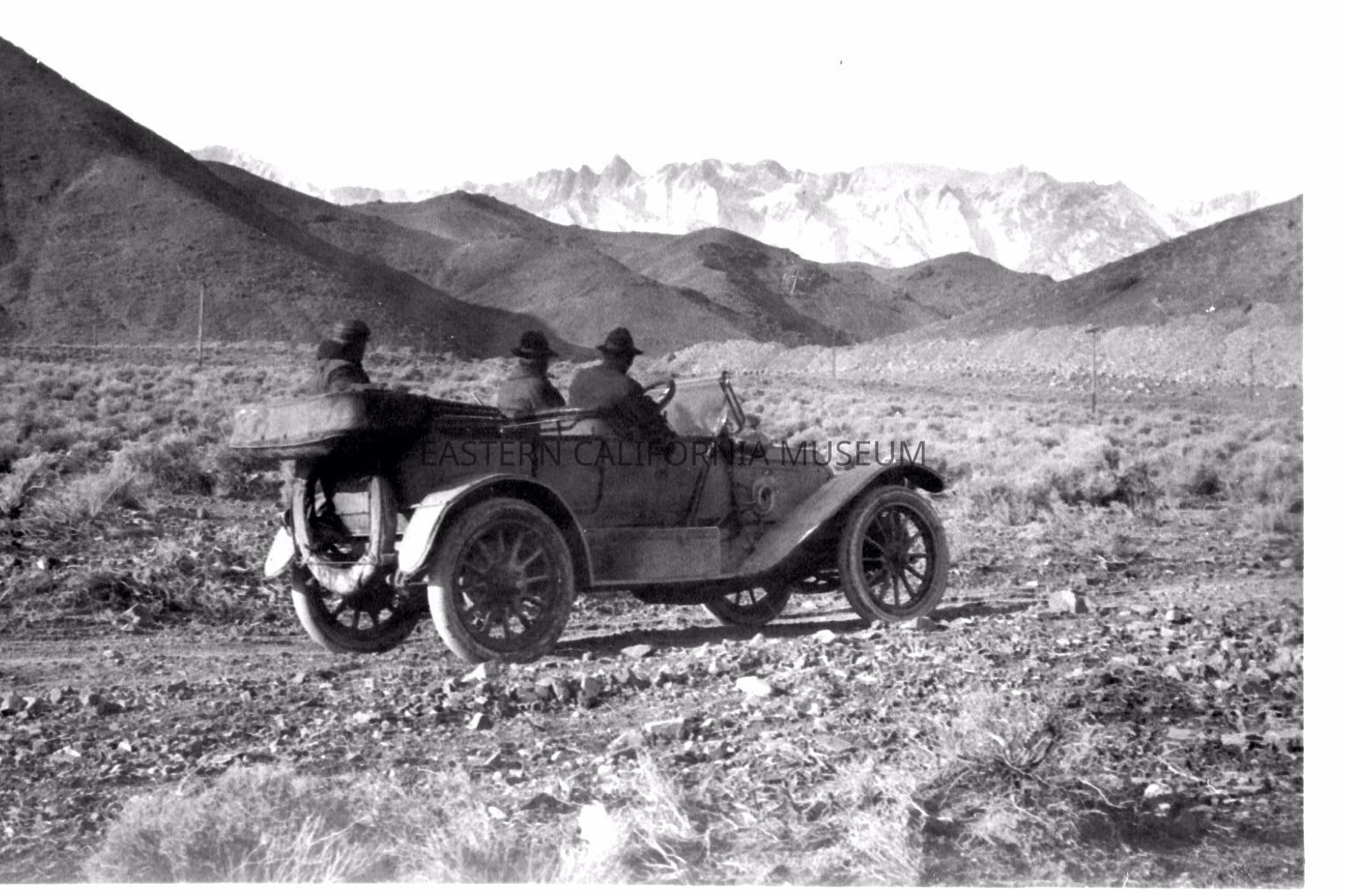 B & W digital scan of LA Aqueduct Officials driving north along Alabama Hills. Mt. Whitney in background.