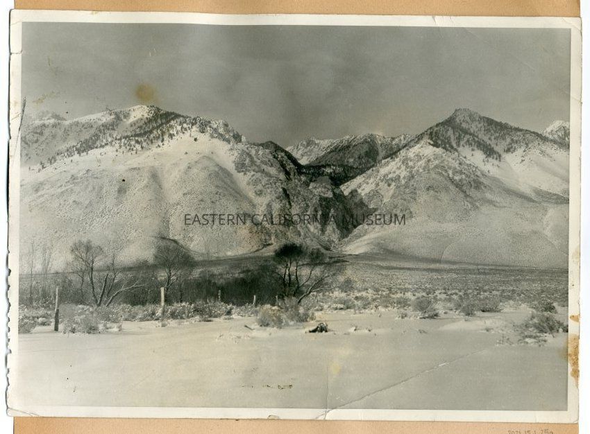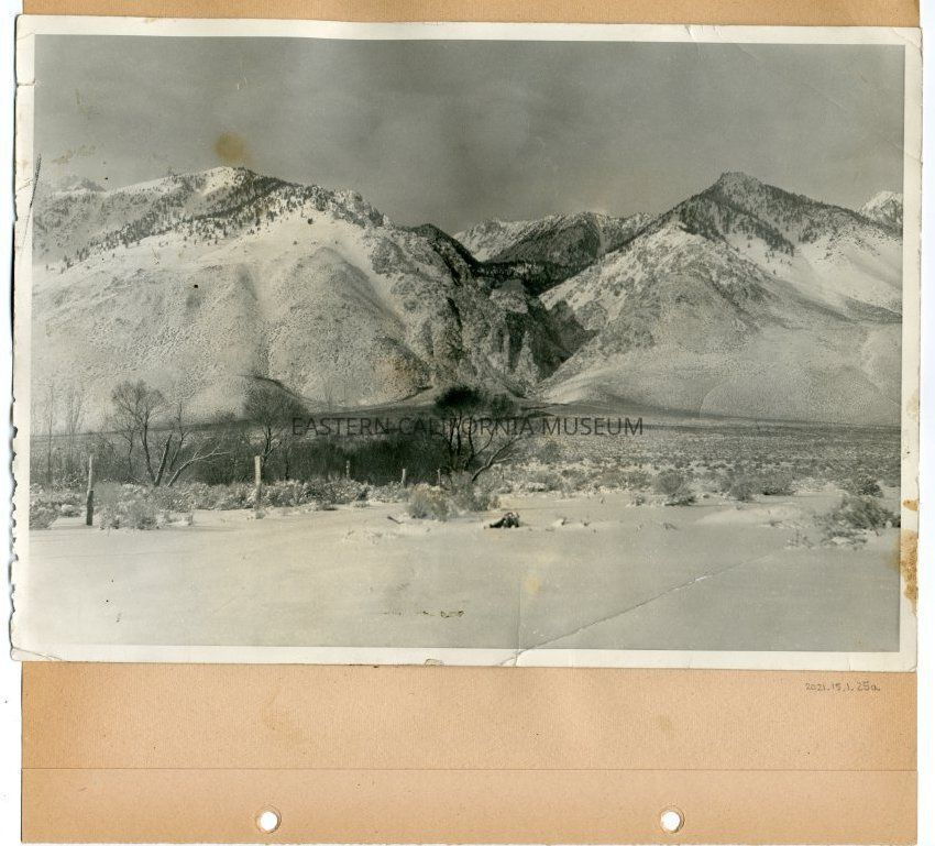 Large photo of the Sierra Nevada mountain range covered in snow. Identified as Sawmill Canyon area by LL in 2021.