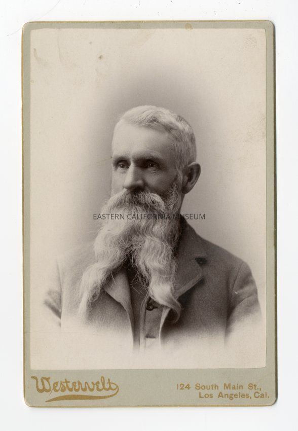 Mounted photo of William Lyle Hunter, Sr., Inyo County Supervisor from 1873-1874. He was the father of Bev [Beveridge] Hunter. In this photo he has a long white beard. Photograph by Westervelt of Los Angeles.Collection