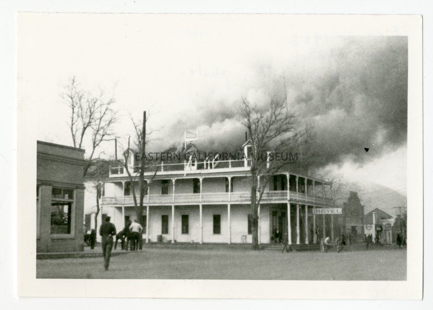 Black and white photograph of the Norman Hotel in Independence on fire on December 30, 1923. This photo is taken from the street, shows people around the building and lots of smoke, which is blowing towards the right side of the photo.Made/Created