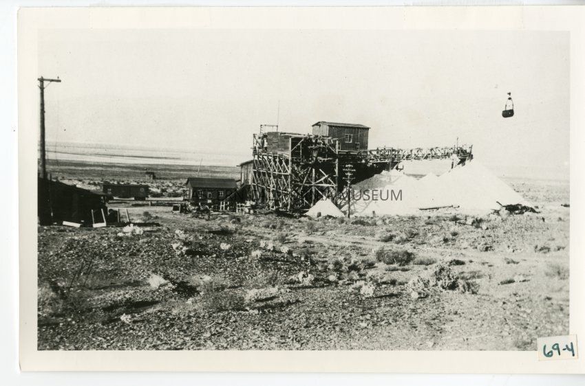 B/w photo of a large wooden structure, likely the tram terminal, and a huge pile of salt. There is a salt bucket on cables in the right side and a power line on the left side. Appears to be a boxcar (maybe Southern Pacific?) on rails.