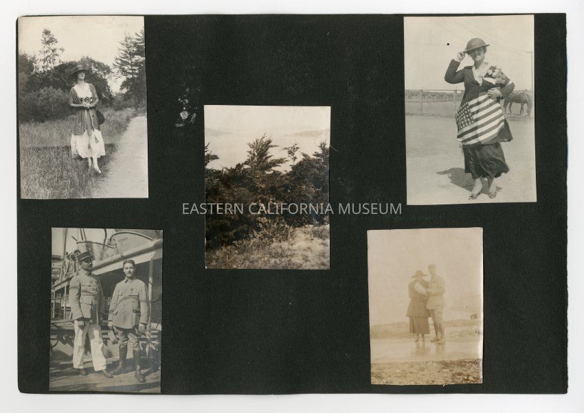 A1831.3.5b: Exterior photo of a woman holding an American flag and wearing a soldier's metal hat/helmet. There is a horse in the background, and possibly barracks. Same photo as A1831.4.37e, in which she is identified as Helen Gunn.