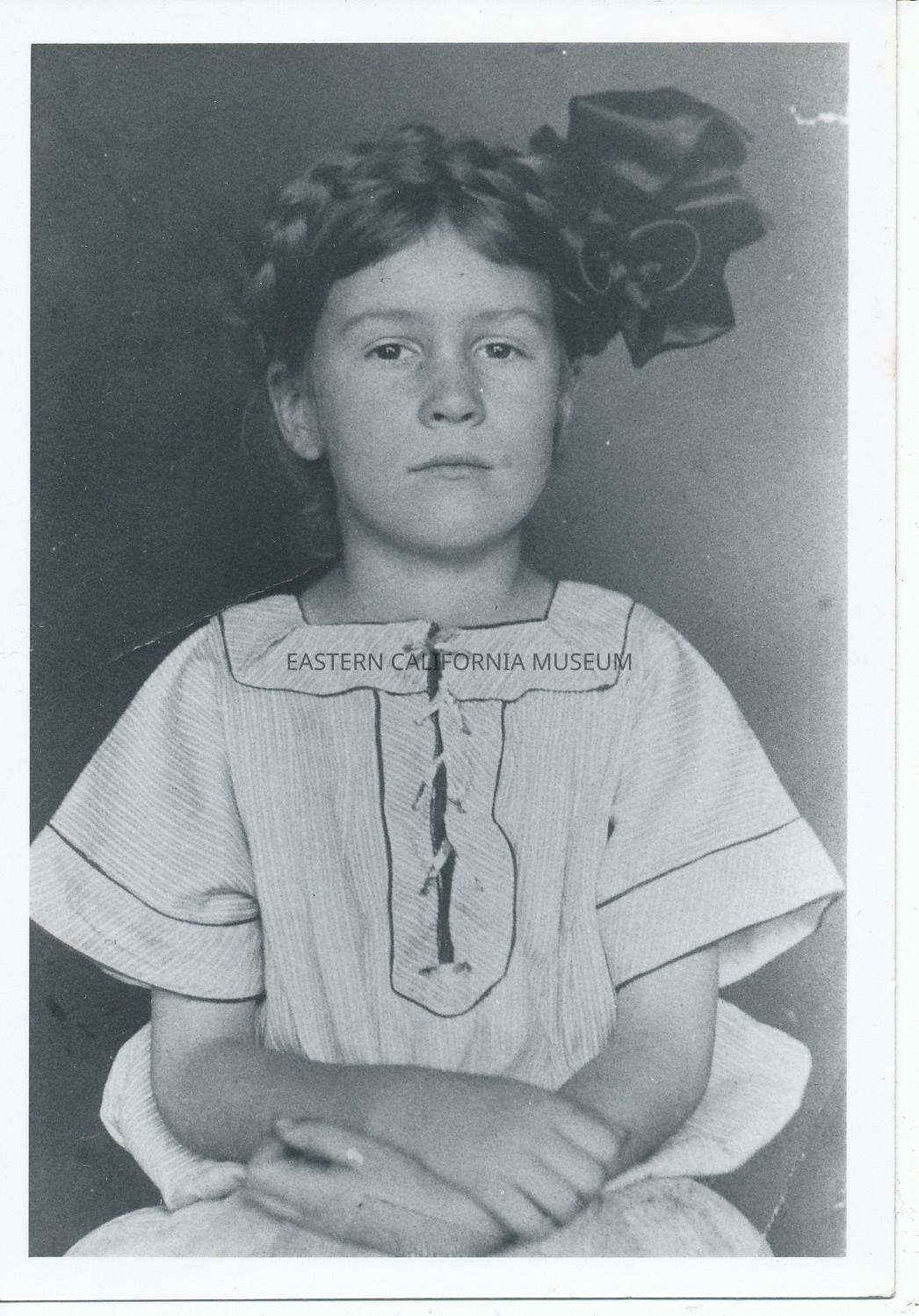 Copy of a photo of a young girl wearing a lace-up top or dress with an braided crown hairstyle and large bow. She might be Charlotte Natalie Passino of Lone Pine.Collection