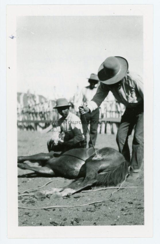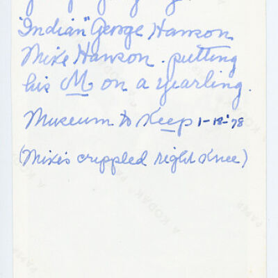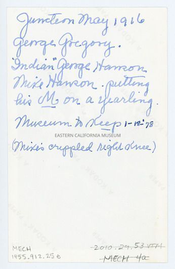 The photo is also mentioned in letter 1955.912.67, in which Elizabeth Mecham clarifies, "So the picture shows Panamint George standing, George Gregory holding the colt's head, and Mike putting his "M" on the colt's left hip."Collection