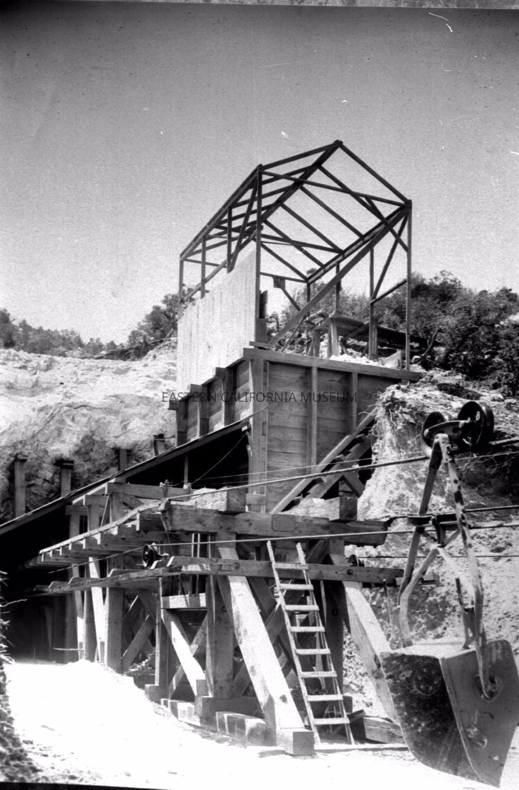 B & W digital scan of Tram Terminal at LADWP's South Quarry where buckets were loaded with limestone and transported a mile to a Bin