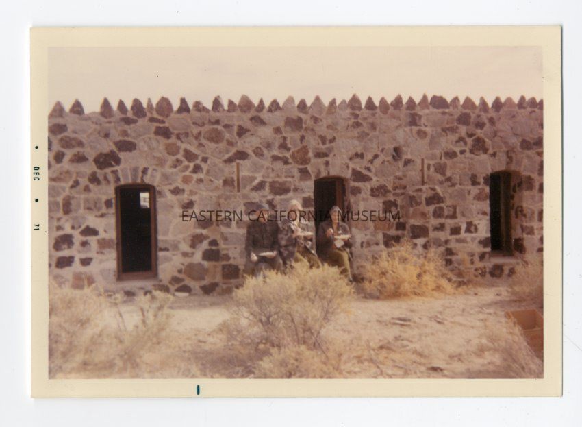 Color photo of three people sitting next to a stone building in the desert, possibly eating lunch during a museum field trip.