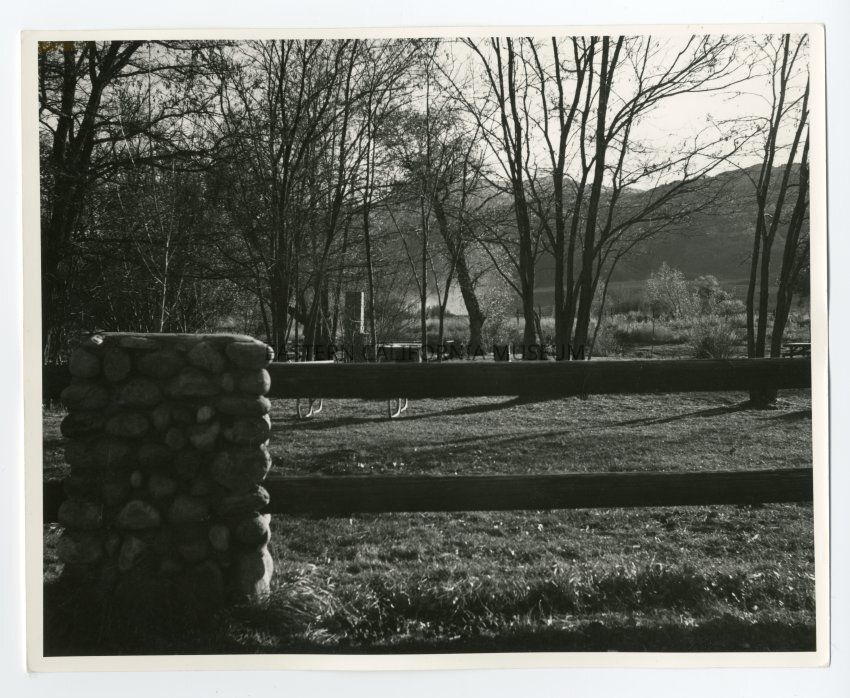 Photo of fence and campsite at Izaak Walton Park. Photo likely by Tom Ross.