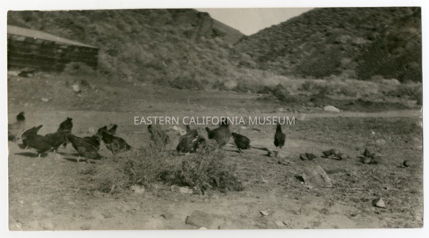 Large photo of a bunch of chickens and quail. Written in pencil on reverse: Quail and chickens in Westgard Pass Canyon. Written in blue ink on reverse: Scott.