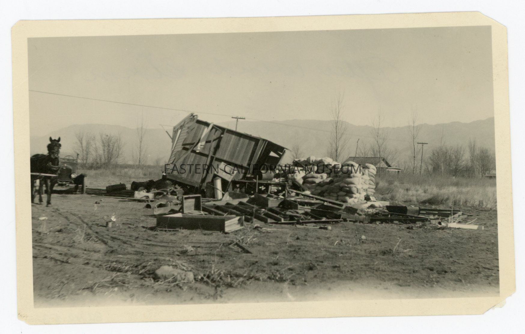 Photo of a completely destroyed building. There is a tall stack of bags (sandbags?) standing. There is a horse and vehicle off to the left side. In the background is an intact house. Location might be Manzanar, but uncertain.