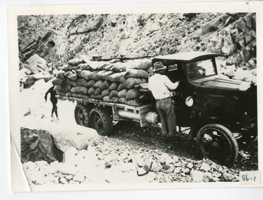 B/w photo of a truck hauling many bags (likely salt) along a dirt road. There is a man driving, one man hanging off the side, and another person walking behind the truck. Written on the door is, "Sierra Salt Co."
