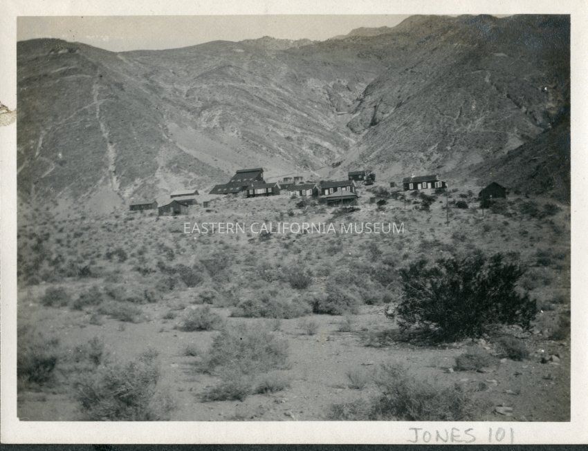 Manzanar Reward Mine and the camp associated with it at the base of the Inyo Mountains. Mill structure just left of center.