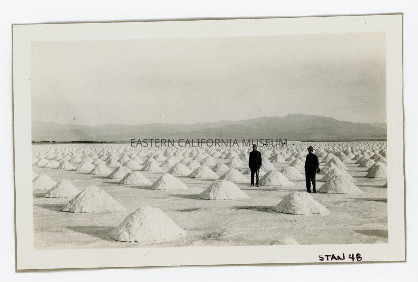 Photo of two men standing amidst piles of salt on the salt lake in Saline Valley. Photo taken looking north with the Saline mountain range in the background.Collection