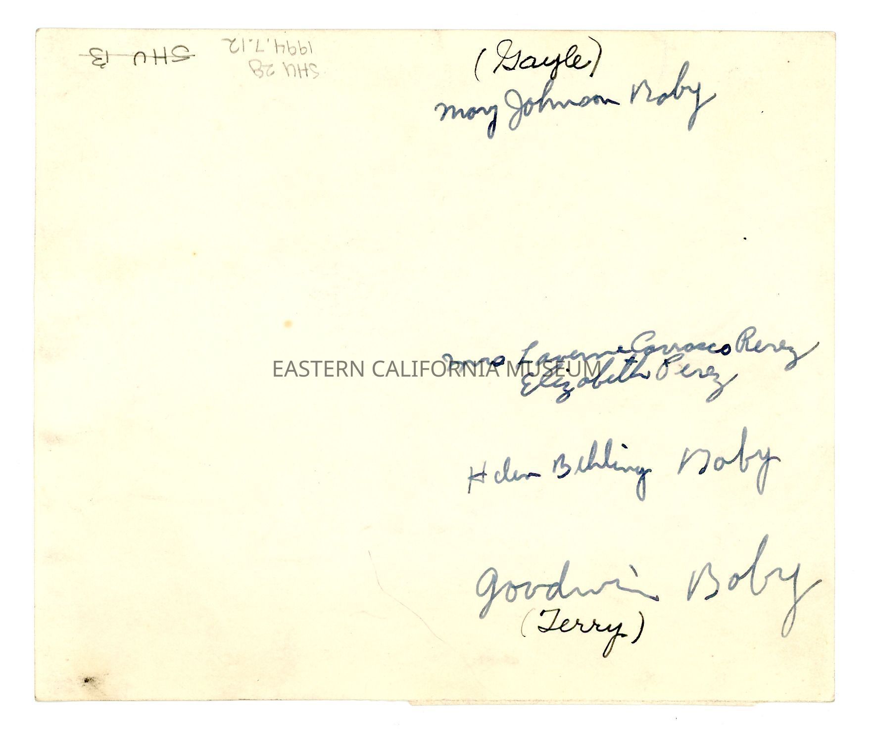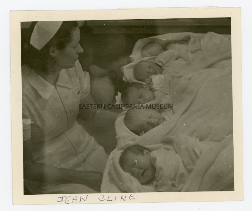 Photo of the interior of the Mt. Whitney Hospital in Lone Pine showing a nurse with five babies. Written in blue ink below image is, "Jean Cline." The babies are identified on the reverse from top to bottom as Goodwin's baby (Terry), Helen Billing's baby, Mrs. Laverne Carrasco Perez (Elizabeth Perez), and Mary Johnson's baby (Gayle).Collection