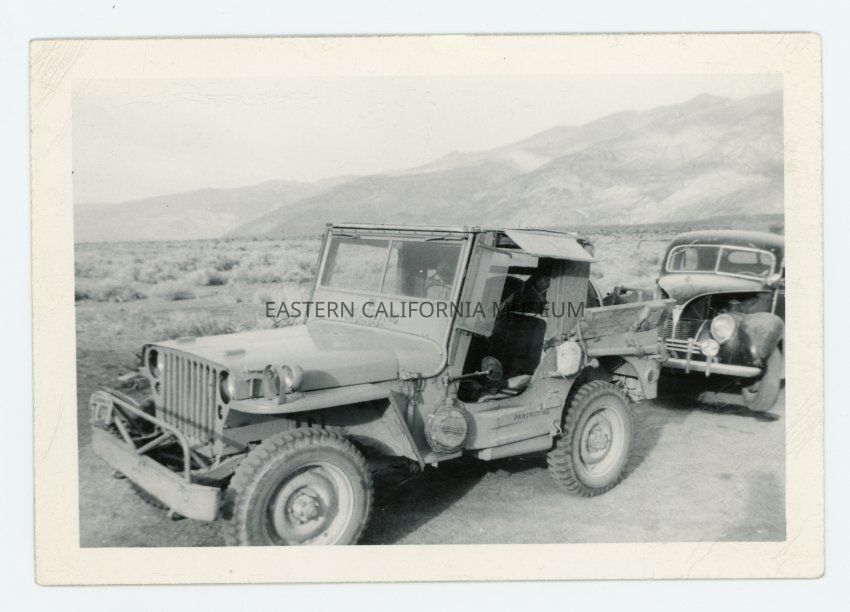 Photo of the jeep owned by Charles Ferge, better known as Seldom Seen Slim, that has "Go Prospecting with Seldom Seen Slim" written on it. There is another vehicle parked behind it.Collection