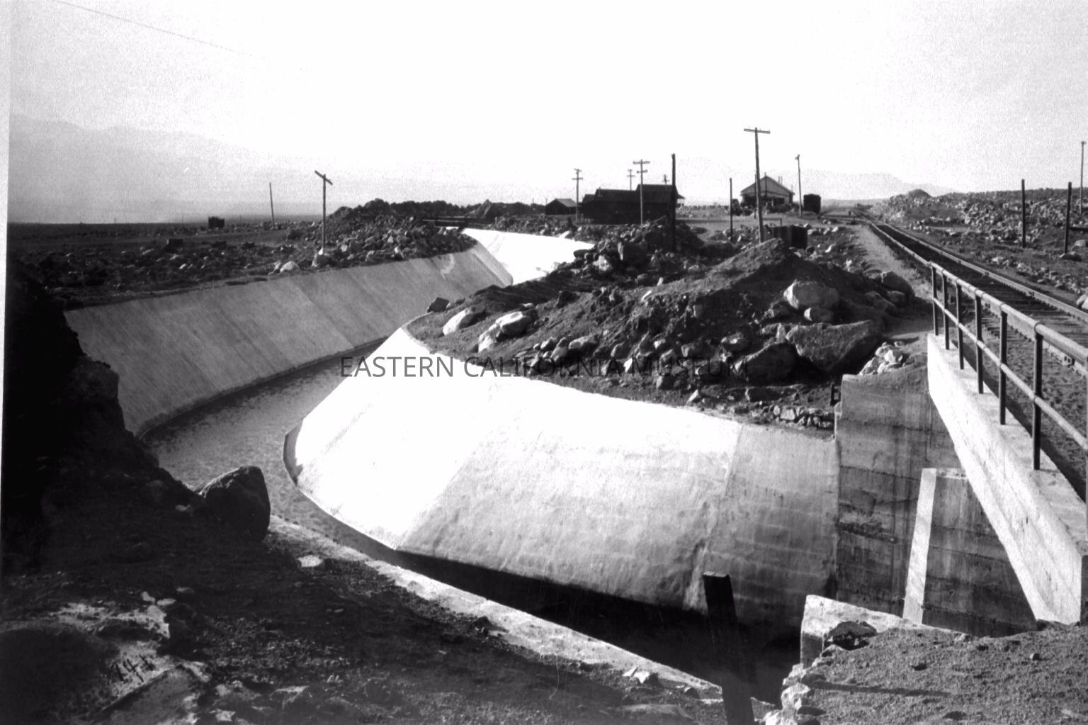 B & W digital scan of Open, Lined section of LA Aqueduct passing under Southern Pacific Broad Gauge Railroad bridge. Unidentified station and siding to the right of railroad tracks (in background)Collection