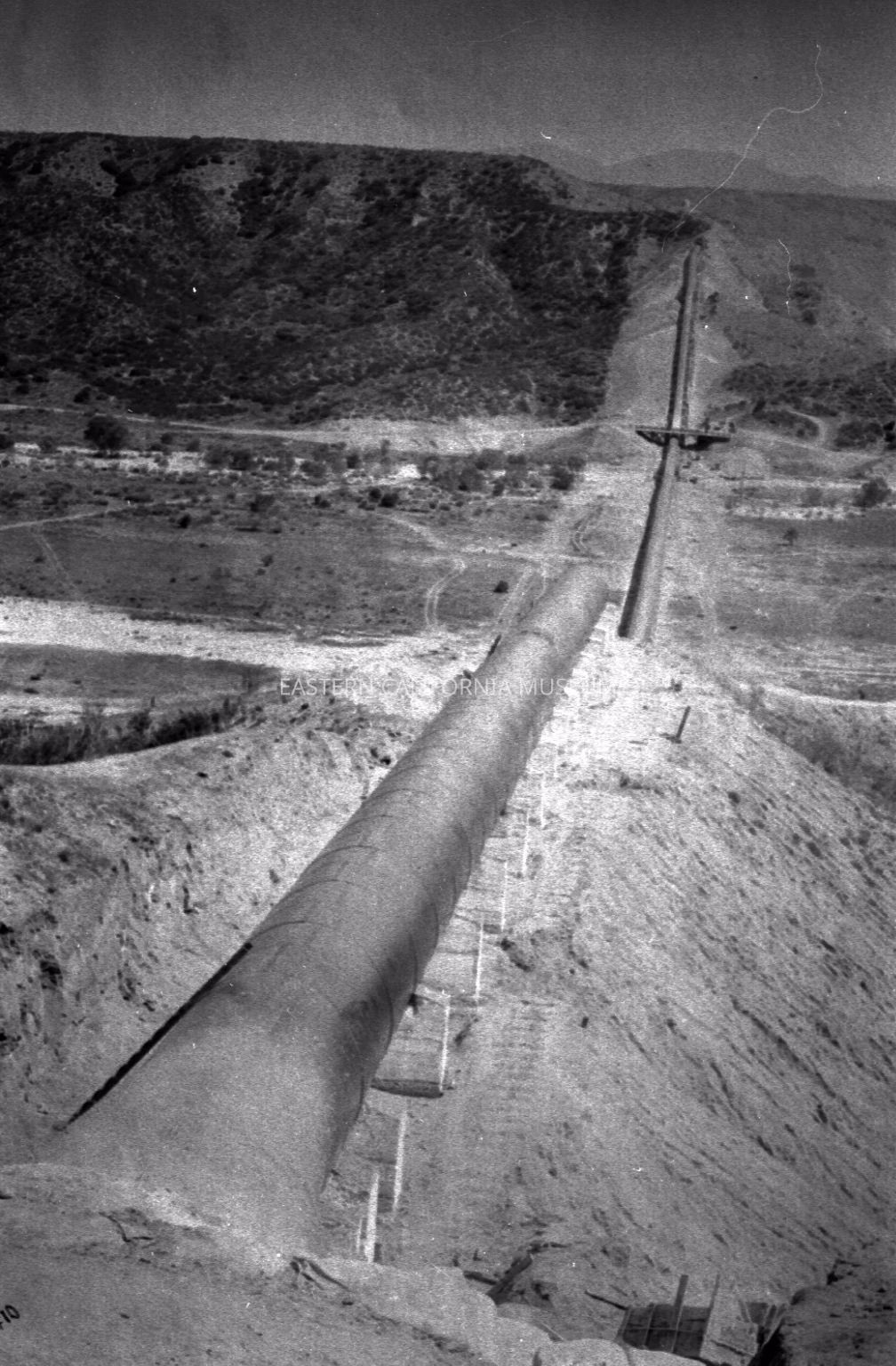 B & W digital scan of LA Aqueduct Inverted Siphon. "Canyons re crossed with steel pipes under pressure heads varying from 60 to 850 feet. The materials for construction were conveyed up the mountain sides in many instances by aerial trams." LA Aqueduct Construction, Final Report, pg. 75Collection