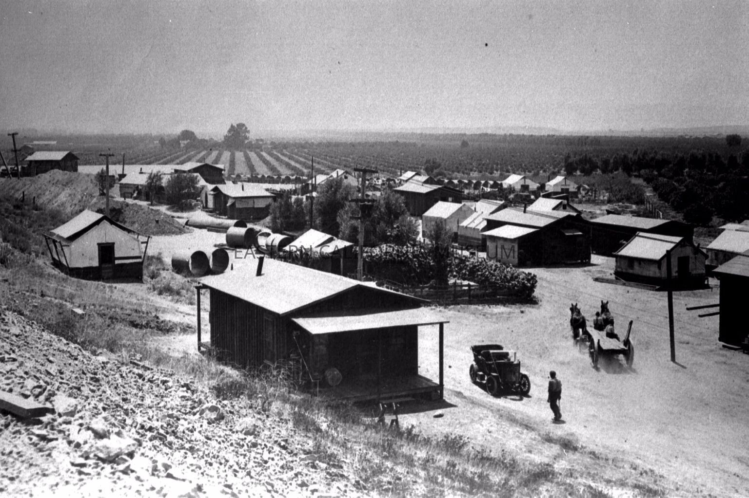 B & W digital scan of LA Aqueduct Construction Camp, possibly located in the Antelope Valley given agricultural fields adjacent to the camp.