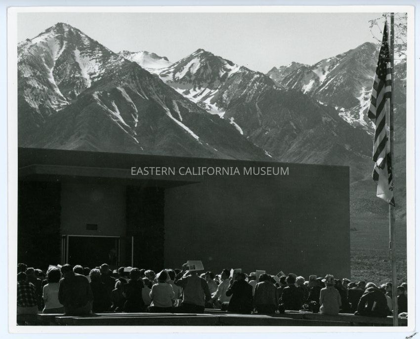Photo taken during the Eastern California Museum dedication on April 7, 1968 showing building, flags, people, and mountains in background. Tom Ross took the photo.