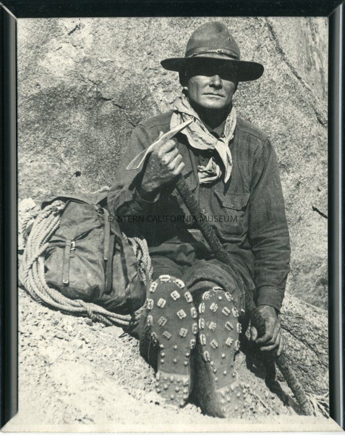 B&W glossy print: close up of Norman Clyde in his mountaineering garb with mountaineering equipment