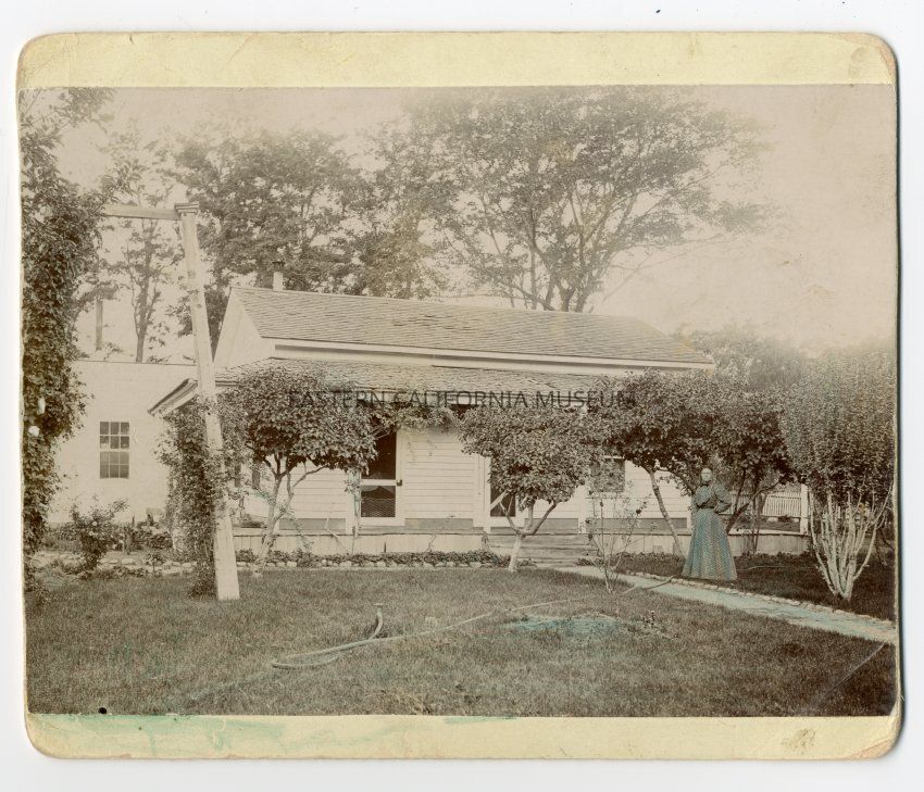 Mounted photo of the Gunn Home in Independence. There is a woman standing in front. There is a yard with a water hose in the middle, at least four or five shrubby trees, a walkway to the door lined with rocks, and a structure behind the house that may be another residence. Someone has taken blue and green to the photo and tried to color in the woman's dress and the lawn.