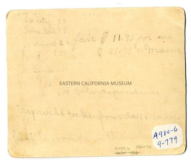 There is extensive writing in pencil on reverse: "To city 50. To capital 75. To Reno 125. To H [illegible, Hawthorne?] 100. To Benton 100. To Ind [illegible] 150." The sum of all these figures is "600 [miles?] to Independence" and "trip will take four days easy, can be made in three days." Also "faire [fare] $11.95 for me" and "$21.95 for Mama."Collection