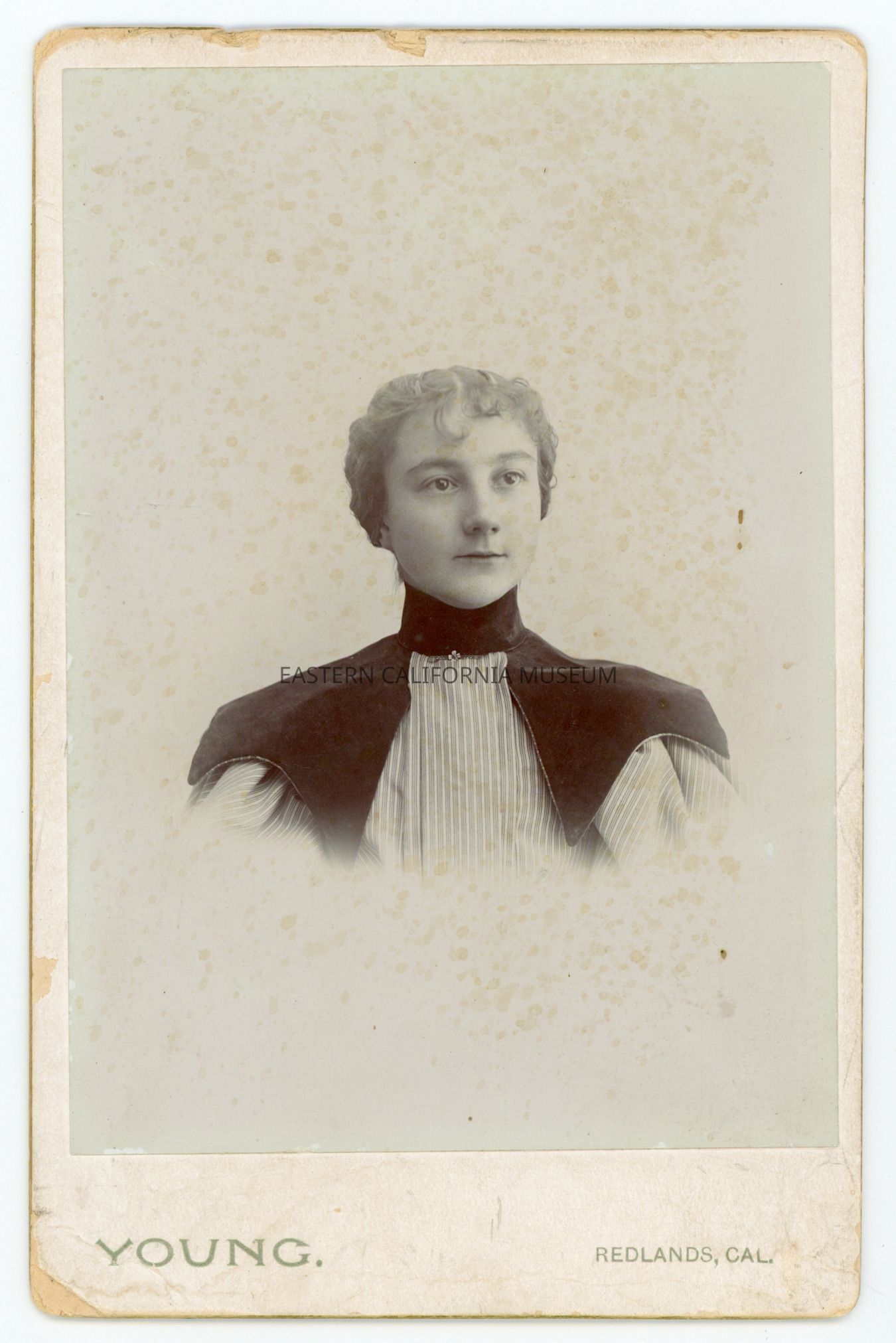 Mounted studio bust-length portrait of a woman. She is identified on the reverse as Cora Craig, whose sister married Judge Densmore. Photographer was Young of Redlands, CA.