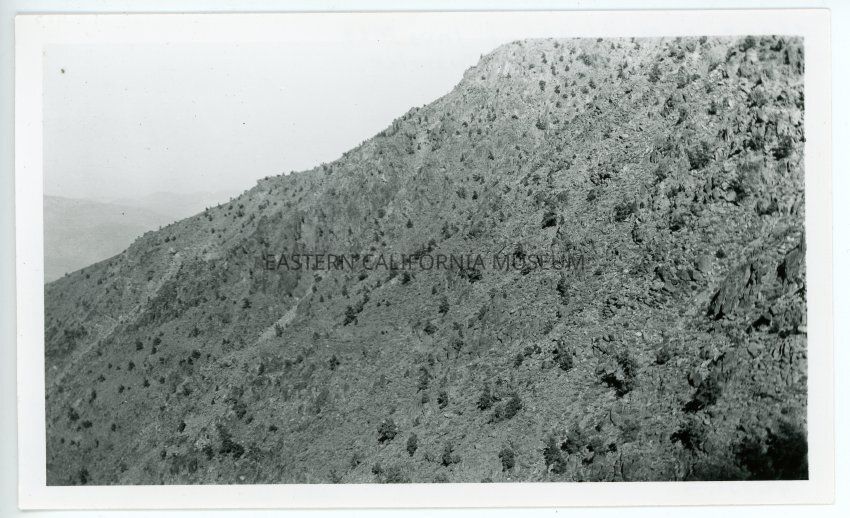 Black and white photograph of the side of a mountain. On reverse: "Steep east slope of Inyo Mountains, typical of Beveridge District."