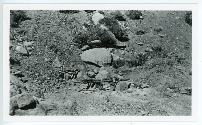 Black and white photo of what appears to be the remains of an arrastra. Hillside, dirt, rocks, in background. On reverse: "Arrastra, Beveridge Mining District, 1908."