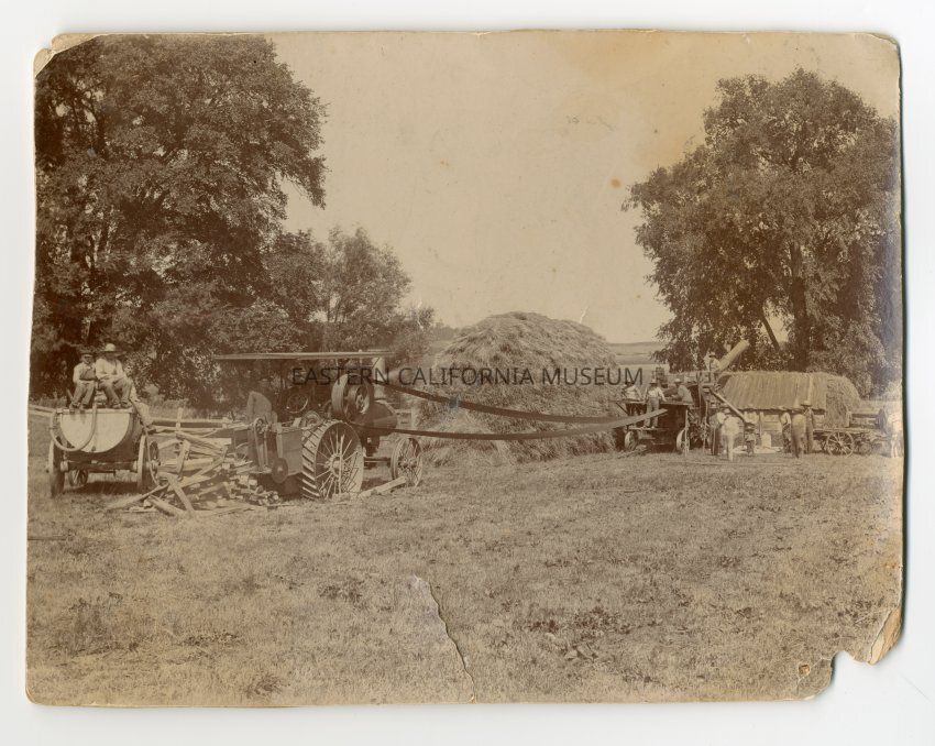 Mounted photo of a group of people using a steam tractor to harvest hay. There is a large haystack in the center of the photo. There may also be a water wagon as well. No date or location information.Collection