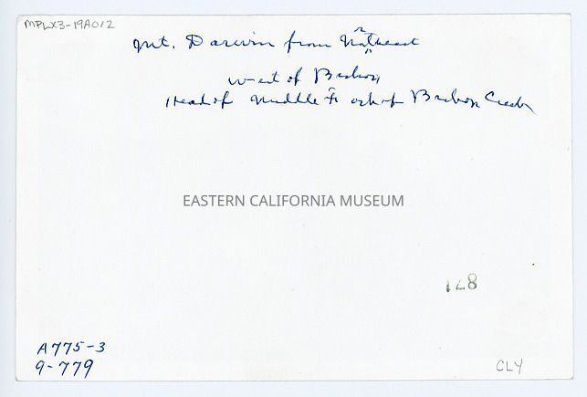Handwritten in blue ink on reverse: Mt. Darwin from northeast. West of Bishop. Head of Middle Fork of Bishop Creek.Collection