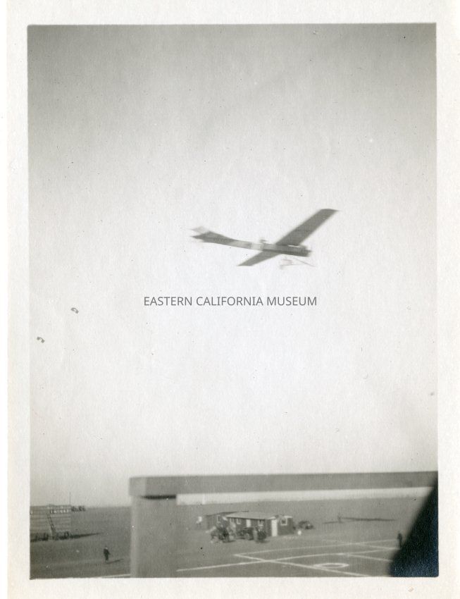Airplane flying above an unidentified location. There are two buildings on the ground, and possibly a field or airstrip. Photograph appears to have been taken from a grandstand.Collection