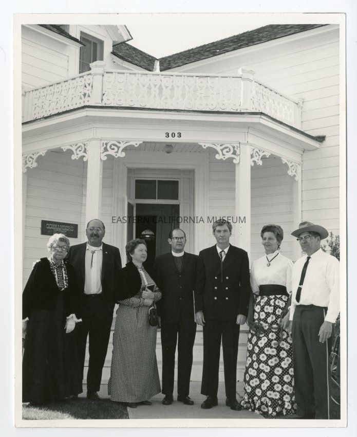 Handwritten on reverse: E. Ca. Museum Bd members, Dorothy Cragen, 81 yrs. old, Victor Wisehart, Big Pine, Josia Lee and Rev. Charles Mitchell, Indep. Meth. Ch., John K. and Tansy Smith, Bill Caipen, retired DWP employee.