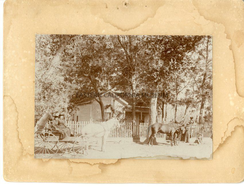 Mounted photo of several people in front of what has been identified as the Robinson house in Independence. There is a white horse and buggy to the left of the photo with two women sitting in it (one woman is wearing a polka dot dress). There is a group of five people and one horse to the right of the photo: one man holding the reins of the horse (but not mounted), a boy sitting on the ground, two women, and one baby in a woman's arms. The house is surrounded by a picket fence and trees.