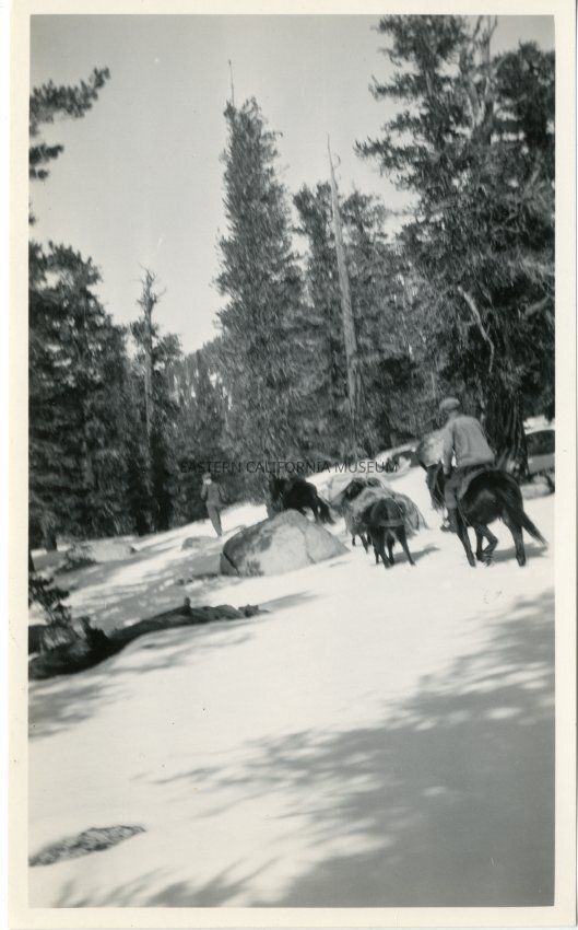 Blurry shot of the Cottonwood Creek Snow Survey Team on horseback in snow at elevation 10,000 feet.