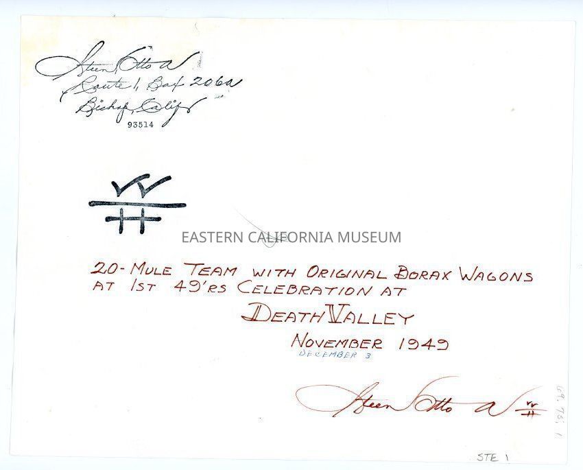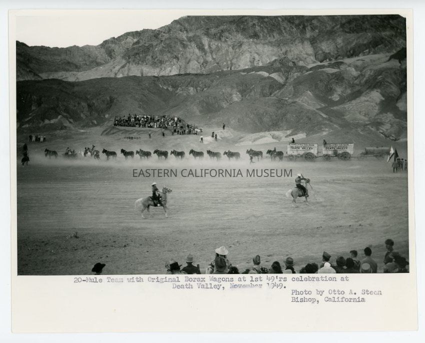 Photo of a 20-mule team hauling original Borax wagons in Desolation Canyon during the first '49ers Celebration at Death Valley on December 3, 1949. Russell Spainhower was the mule skinner or driver. Photo taken by Otto A. Steen of Bishop, and autographed on reverse.Collection