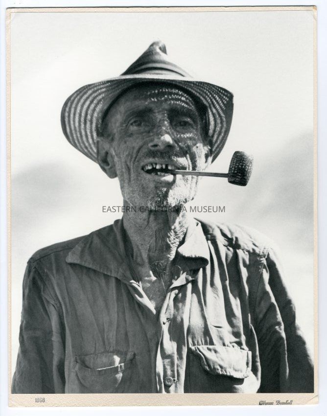 Mounted enlarged photo of Charles Ferge, better known as Seldom Seen Slim, with a pipe in his mouth. Stamped below photo with "1968" and "Wyman Bramhall."