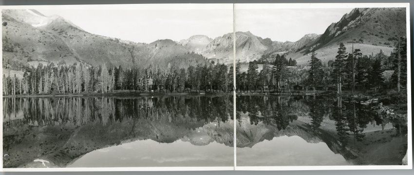 This is a panorama printed on two sheets with cloth backing. Stamped on back is "Frasher's 158 E. Second Street Pomona Calif." Handwritten in pencil on reverse is "7-453" and "Virginia Lakes Camp (Reflection)".