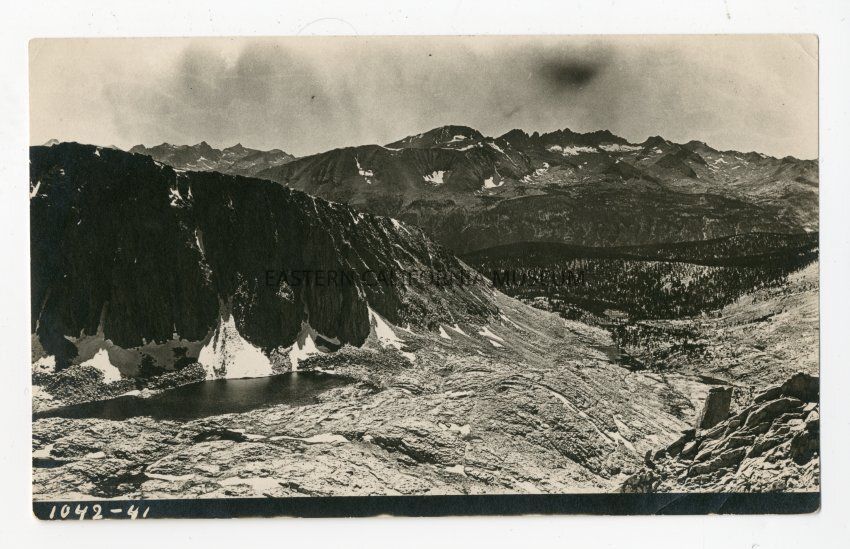 Black and white photograph of a mountain lake surrounded by rocks and snow. Writing at bottom says, "1042-41."