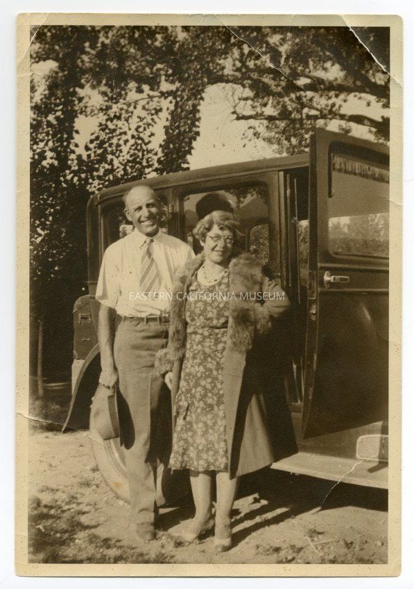 Enlarged photo of an unidentified man and woman standing by a car. She is wearing a coat with fur trim, and he is wearing a short, wide tie. Maybe circa the 1930s? Could these be the donor, Gladys Zug, and her husband? Or family members?