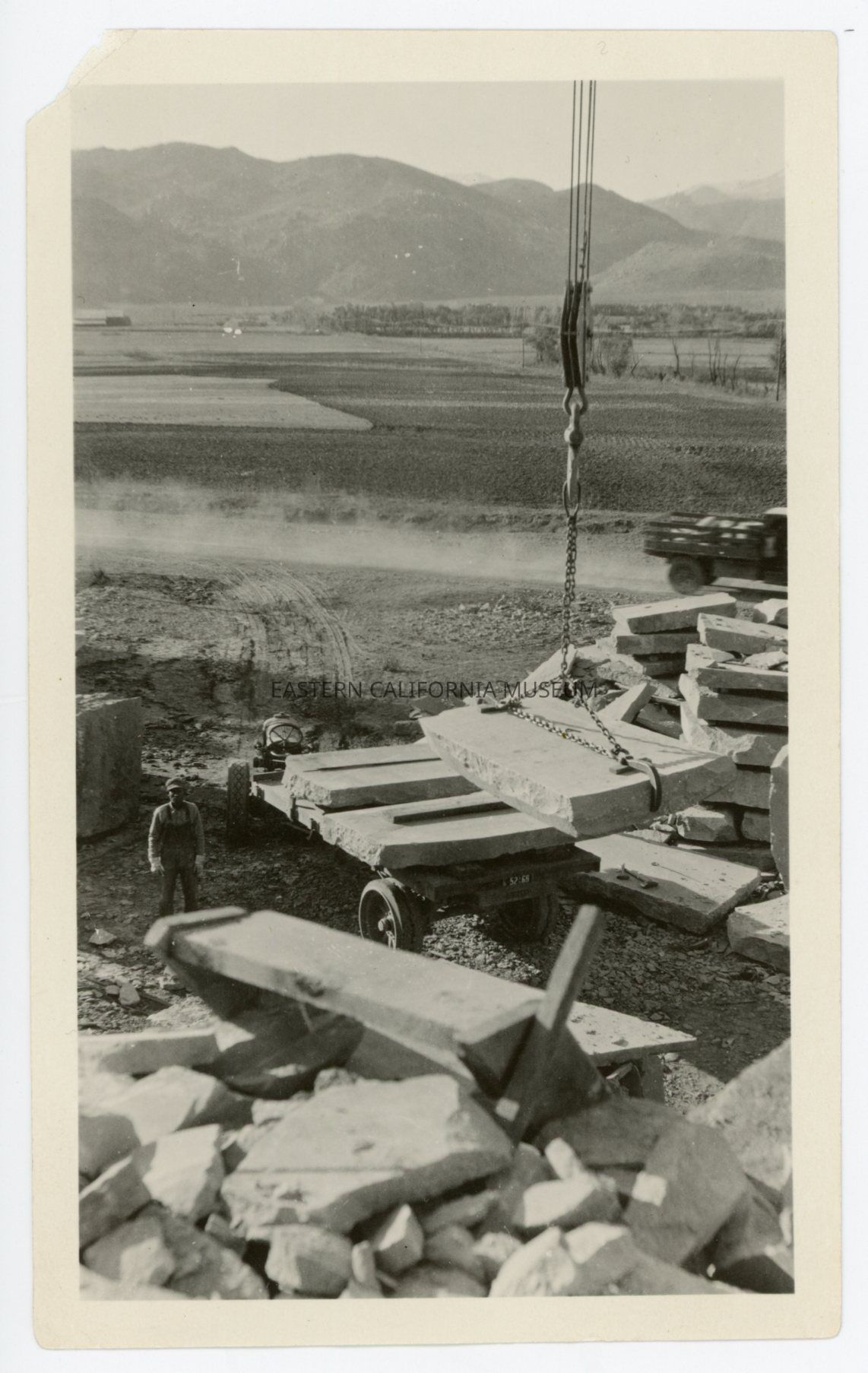 Photo of hoisting stone at the quarry at Round Valley. There is a man and a truck at the bottom. Dirt road, pick-up truck, ranches, and mountains in background.