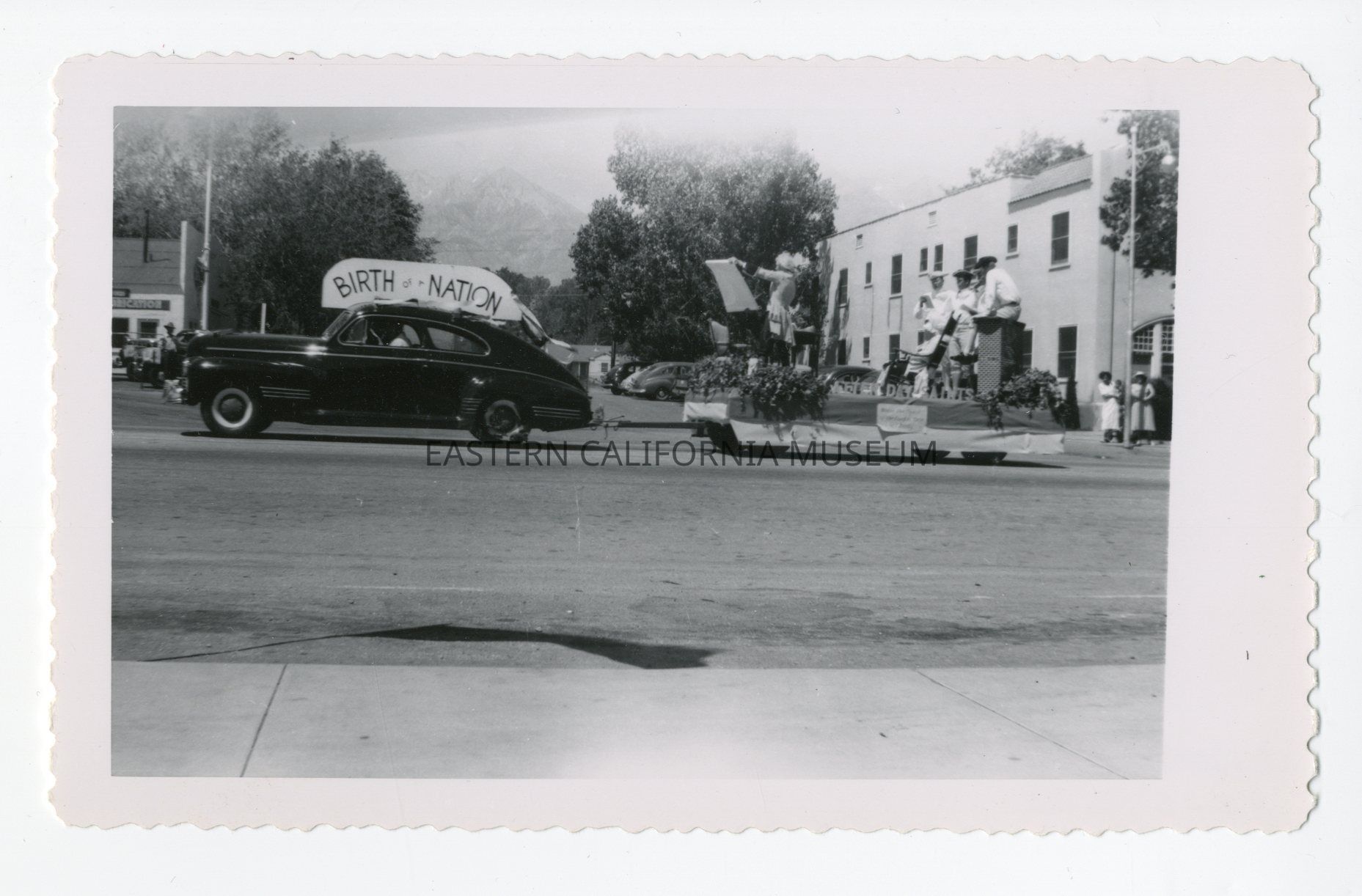 Photo of an automobile pulling a float in the 4th of July parade in Independence in 1950. The car has a sign on the roof that says, "Birth of a Nation," and it looks like there is someone standing on the float in Revolutionary-era clothing reading from a proclamation (Declaration of Independence?).