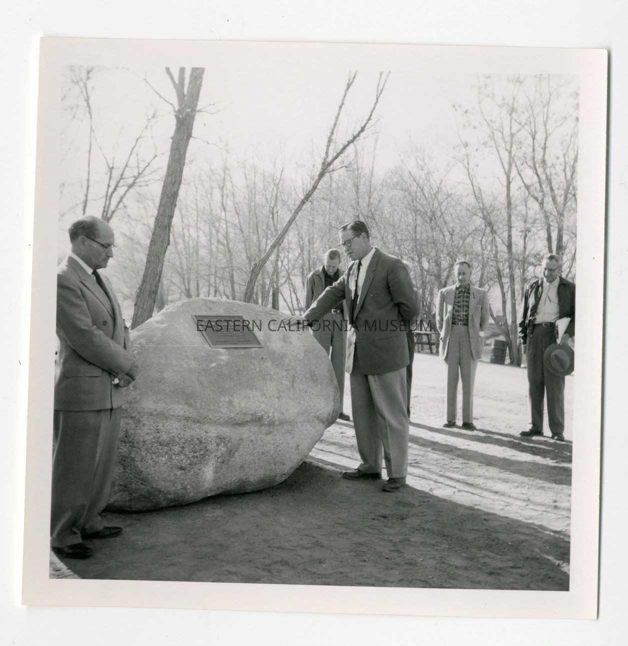 Photo of five men posing next to a large boulder with a metal plaque in it.