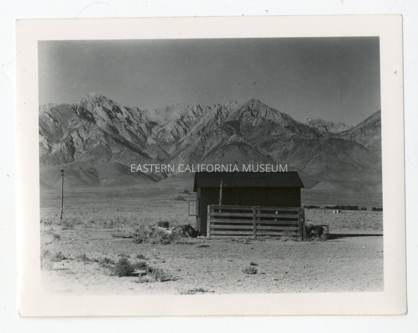 Photo of a small building or shed with the Sierra Nevada mountain range in the background.