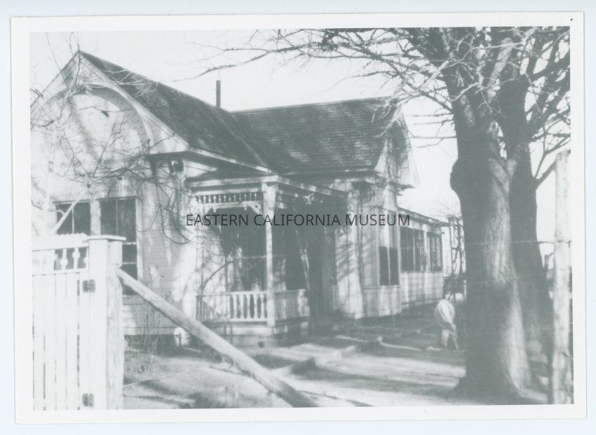 Copy of a photo of the residence of June (Junius) and Eleanor Smith in Big Pine. Exterior view of house shows white fence and tree. House has attractive decorative features.Photograph Details