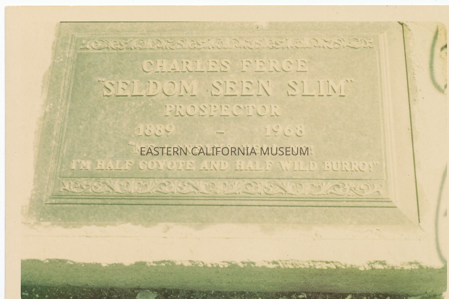 Charles Ferge's headstone. Seldom Seen Slim. 1889-1968. "Me lonely? Hell, no! I'm half coyote and half wild burro!" Photo is faded or overexposed.