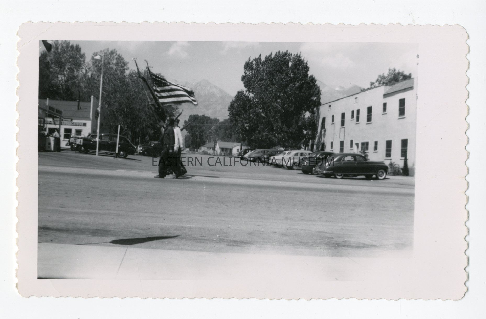 Photo of a row of men, probably members of the American Legion, marching with rifles and a flag in the 4th of July parade in Independence in 1950.