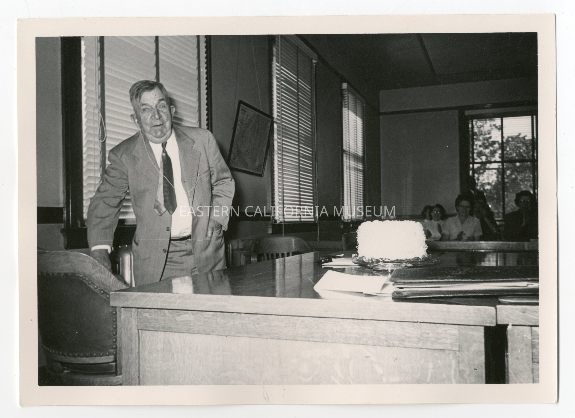Interior photo of John Lubken, member of the Board of Supervisors, standing by a desk. There are several people, mostly women, sitting in the background. A white cake is sitting on the desk.