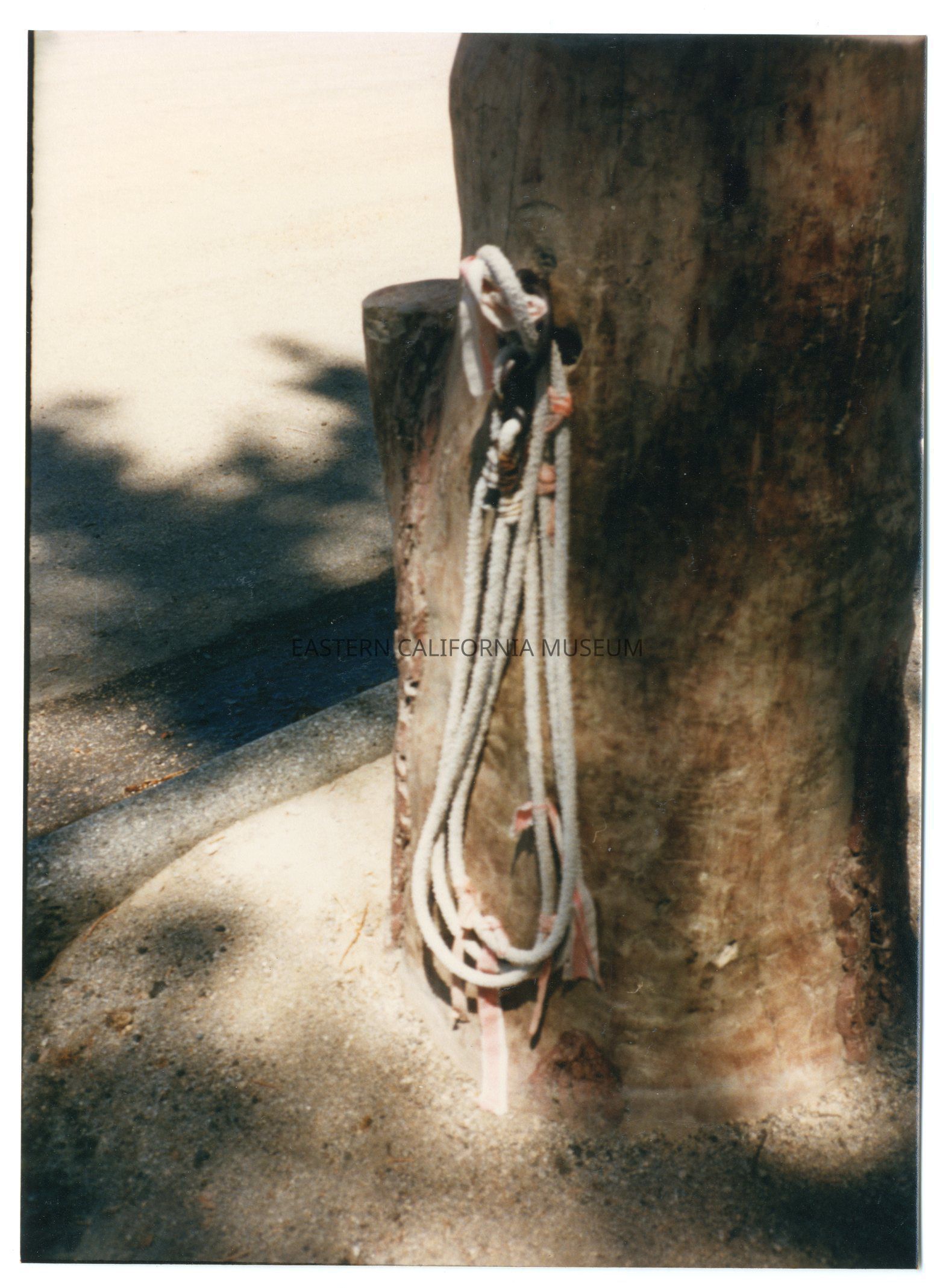 Close-up color photo of one of the two concrete pillars made to look like tree stumps. They were originally made at Manzanar War Relocation Center.Photograph Details